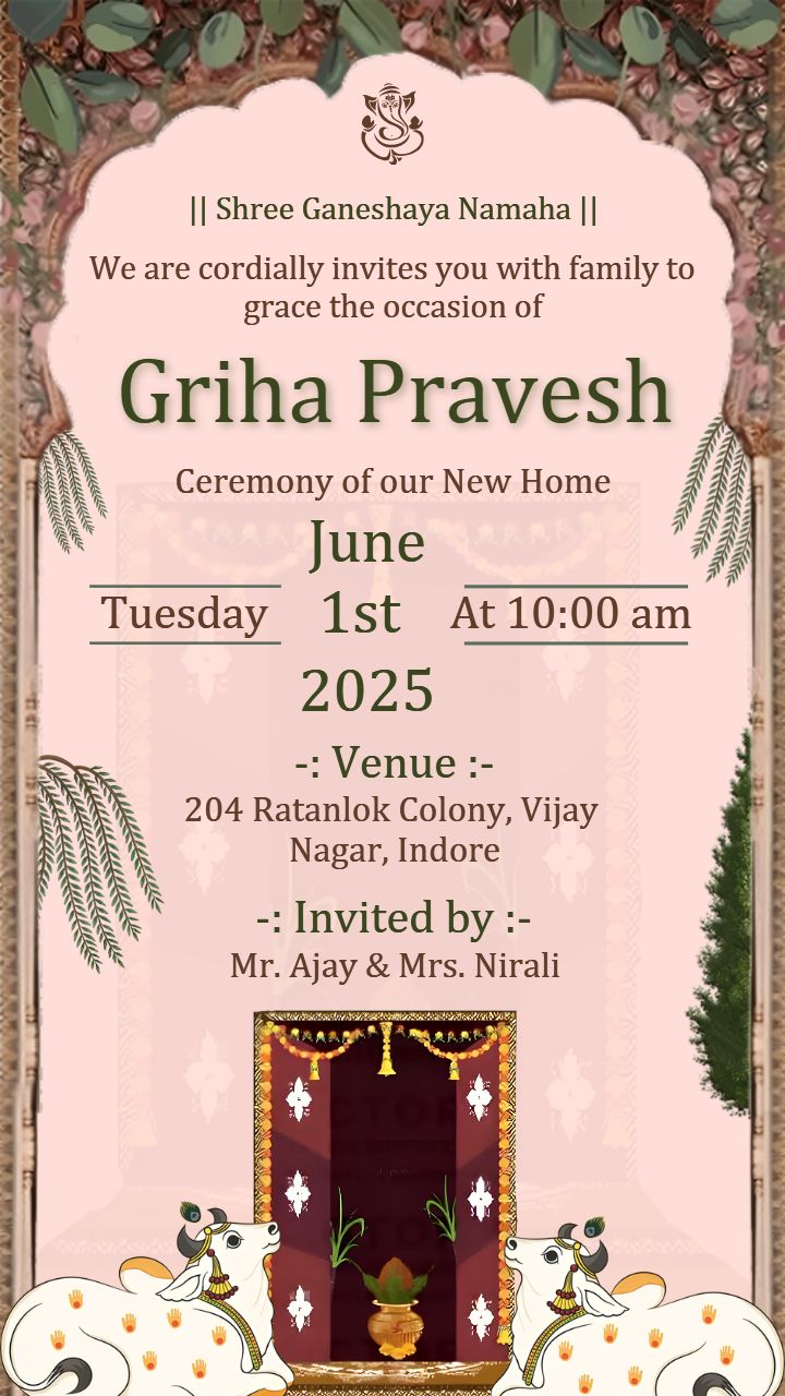 Design your house warming or griha pravesh invitation card in English with Crafty Art. Choose modern templates, edit online, and share with loved ones easily.